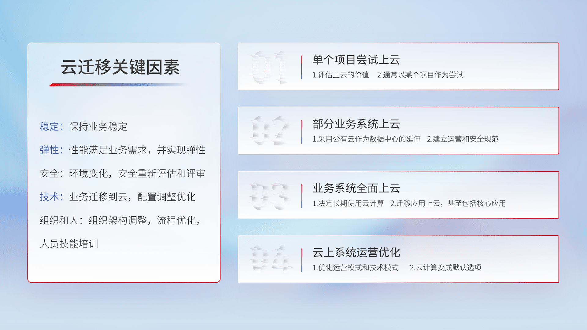 结合实际业务,,从规划设计、、云平台选型、、云原生改造、、、、数据迁移、、、集成交付,,,,迁移全过程为客户识别最佳上云路径,,做好风险识别管理,,,,设计网络架构、、身份权限、、安全审计合规、、、操作审计、、、日志审计、、、监控告警策略、、、、多站点容灾设计等,,对云上基础设施进行整体规划,,提升IT治理水平,,,以满足弹性、、高可用、、、、高性能的需求。。。。